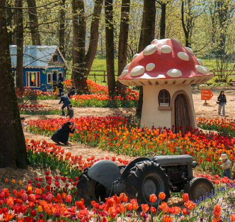 A sea of tulips in our serene forest, filled with photo ops to explore.