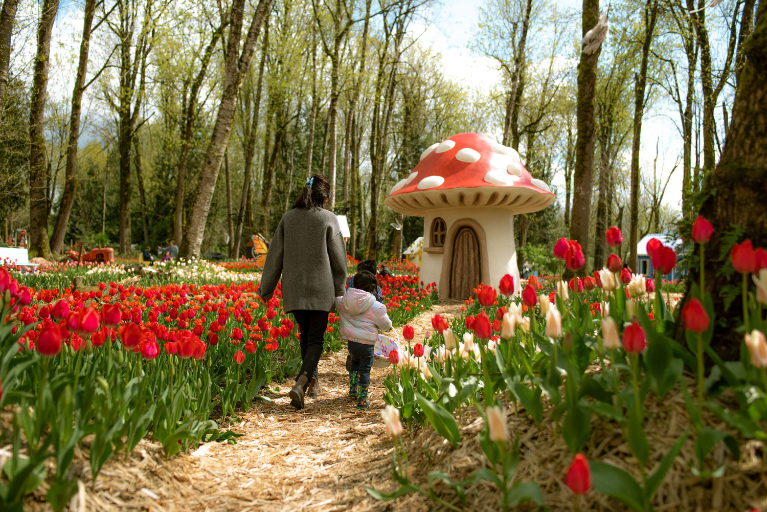 Not all tulips will bloom at the same time. We've planted a mix of early, mid, and late-season varieties with some overlap to create a continuous and colorful display. Bloom levels will vary depending on the weather and when you visit. Earlier in the season, there will be fewer tulips in bloom, while peak bloom happens later as more varieties open up.